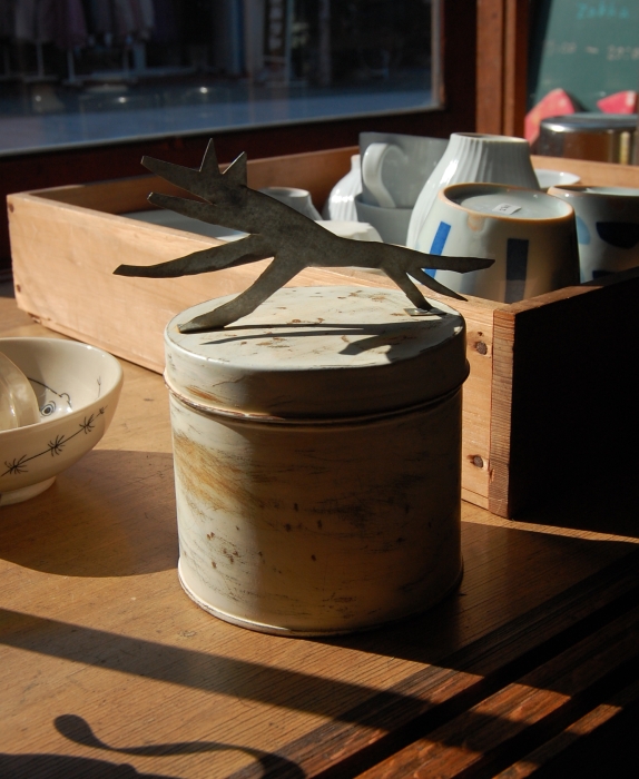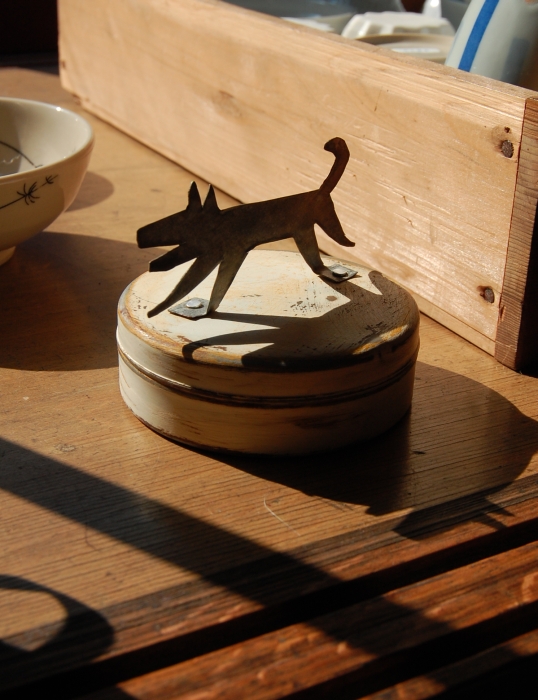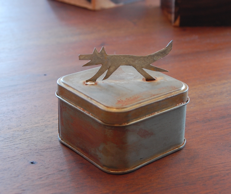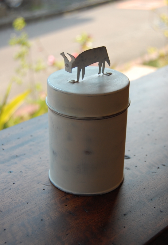 缶にブリキのイヌをつけてみました